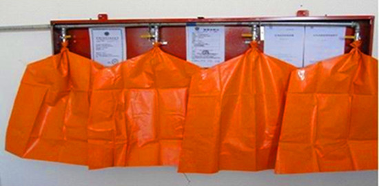 布袋式壓風自救器的結構:布袋式壓風自救裝置組成:自救布袋、雙頭內絲連接螺帽、過濾器、連接桿、墊片及螺