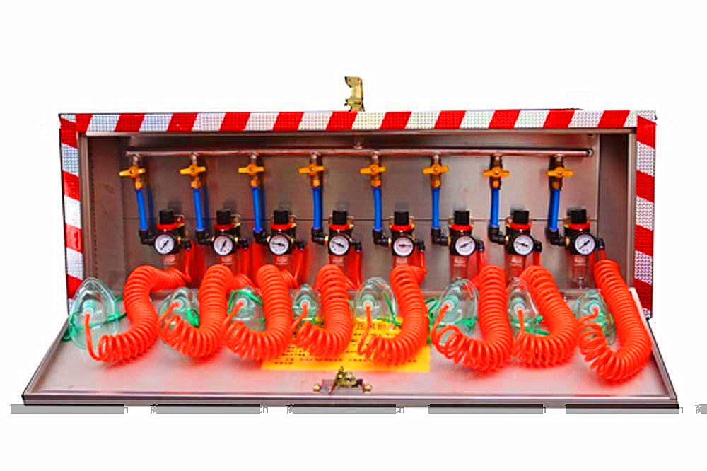 該自救器主要用于具有煤與瓦斯突出的煤礦井下救災防護。箱式壓風自救裝置安裝在煤礦井下銅室或采煤工作面的機風巷進頭的適當位置或流動人員較多的地方,以及溜子頭、井底車場、運輸和回風巷道、各種站房等地。當發生巷道冒頂,煤與瓦斯突出時或有突出預兆時,工作人員跑步進入附近安裝有呼吸器的地點和場所避災,戴上呼吸器,等待救援。